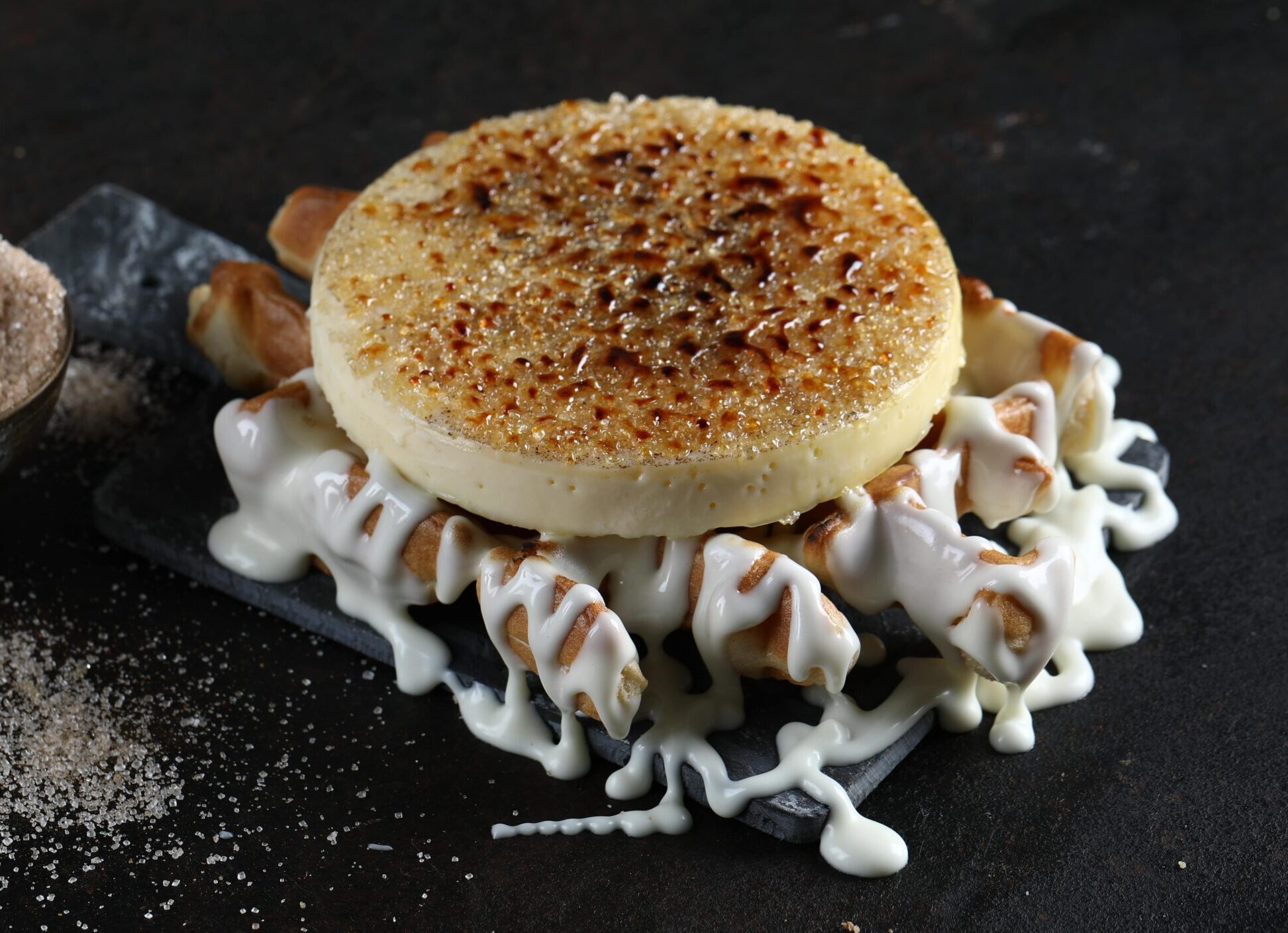 וופל בציפוי שוקולד לבן + דיסק ברולה חרוך + חצי ליטר גלידה
