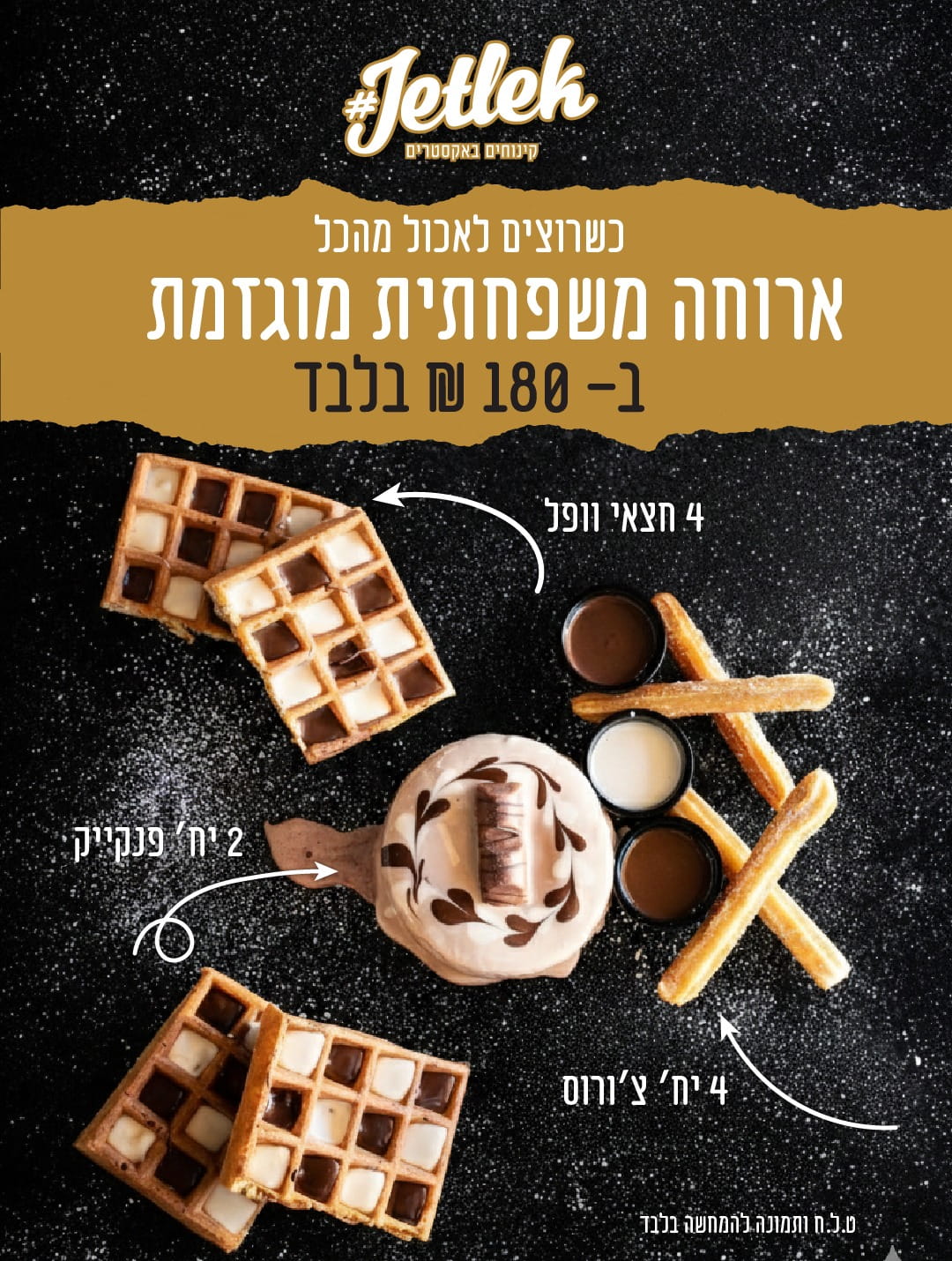 2 יחידות פנקייק, 2 יחידות וופל, ארבע יחידות צ’ורוס ברוטב חום אגוזים ולבן וחצי ליטר גלידה